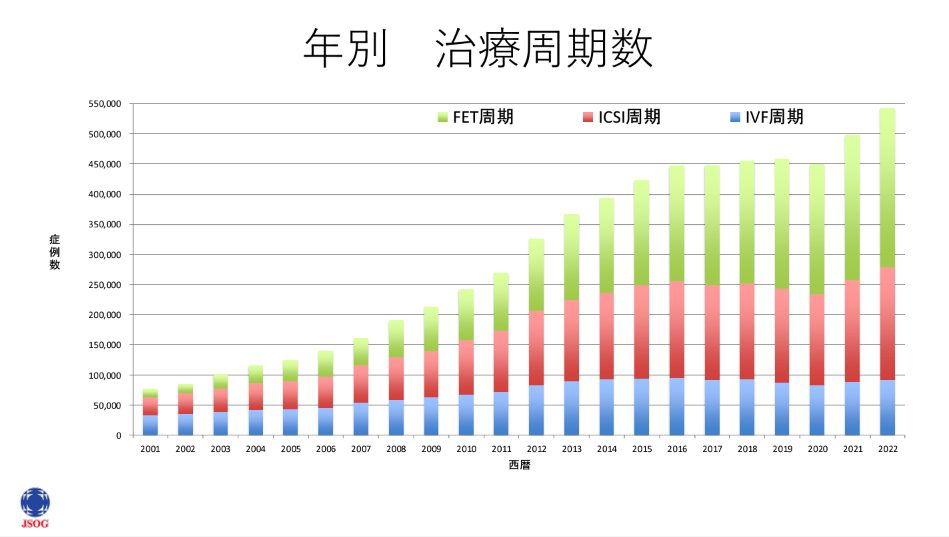 実際に、総治療周期数は2020年が449,900症例、2021年が498,140症例と50万症例を超えることはありませんでしたが、保険適用後はじめてとなる最新版の2022年では543,630症例と報告されているため、大幅に増加していることがわかります。
