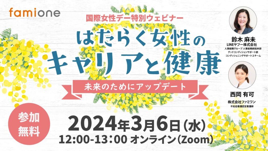 2024年3月6日(水)、ファミワンでは、3月8日の国際女性デーに因み、特別セミナー「はたらく女性のキャリアと健康ー未来のためにアップデートー」をオンラインで開催いたしました。 本記事ではそのセミナーでのLINEヤフー株式会社 鈴木様との対談の様子を... ファミワン -