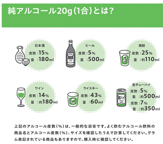 飲酒については、体質や遺伝によって個人差がありますが、男性は40g女性は20g未満の飲酒にこころがけてください。
