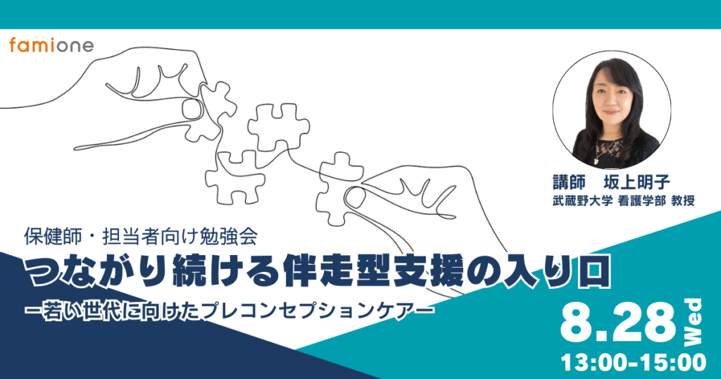 ファミワンは、2024年8月28日に自治体の保健師・担当者等の支援者向けに無料オンライン勉強会を開催しました。 昨今、思春期、妊娠、出産等のライフステージに応じた切れ目のない相談支援等を行う「伴走型支援」が求められています。プレコンセプションケ... -