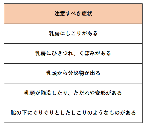 乳がんを発見するきっかけとなる症状の90%はしこりと言われています。そのためセルフチェックがとても大切となってきます。普段と違うなと気付くためにはセルフチェックを日常からしておくことが大切です。