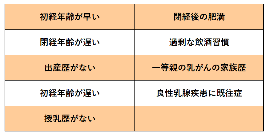 はっきりとした原因はまだわかっていないですが、いくつかのリスク要因は以下のように解明されてきています。リスク要因に当てはまったからといって必ず乳がんにかかってしまうというわけではありません。ただ自分は乳がんのリスクを持っているから日常的に気を付けるようにしようという意識を少し持っていただくと良いかと思います。