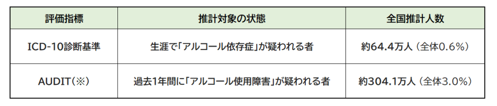 令和6年に公表された最新の調査結果では、私たちの想像以上に多くの方がお酒に関する問題を抱えている可能性が示されました。