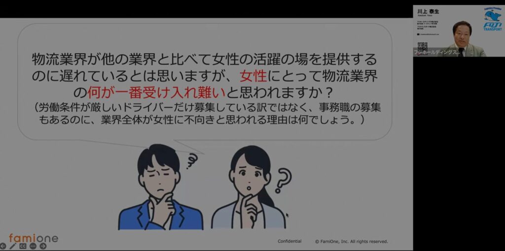 特に運送業というのは、労働集約型産業になりますので、人を確保する、採用するということは、とても重要な事だと思いますので、まずそういうところからご理解を頂いて、仮にそういうところのご理解を頂いているのであれば、これから労働人口が減っていく中で、女性の方に会社に入って頂かないといけないというのは、大きなポイントとしてありますので、過去の事例というところでは、良い答えが今は出てきませんけれども、そういうところは大事だと思いますし、この質問はすごく良い質問だと思います。