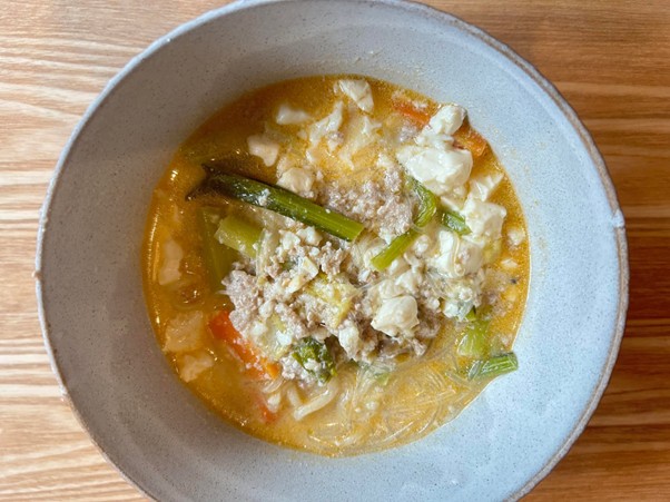 豆乳を加えることで辛味がまろやかになり、胃腸が弱りやすい時期にも食べやすくなります。また、きのこ類を多めに入れると腸内環境が整えやすく、春雨を加えればエネルギー補給にもつながります。沸騰させると豆乳が分離しやすいので、ご注意ください。