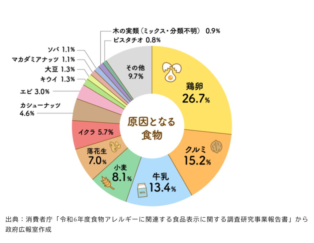 消費者庁の令和6年度の食物アレルギーの調査報告書から、原因となる食物の1位に鶏卵、2位にくるみ、3位に牛乳となっており、全体の約半数を占めています。