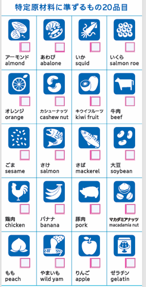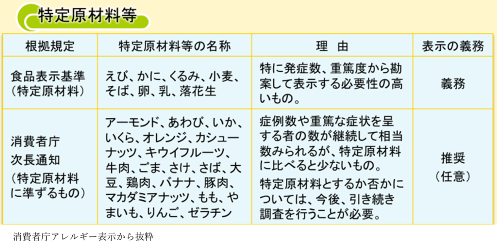 アレルギー表示については表示が義務化されたものと推奨(任意)であるものに分かれています。