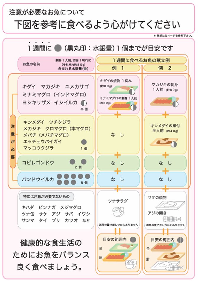 ・・・お魚には良質なたんぱく質やDHA・EPAといった良質な脂質を摂取できるため妊娠中も食べてほしい食材ではありますが、食物連鎖の影響で大きなお魚には水銀含有量が多く含んでいるものも。水銀を過剰に摂取してしまうと、胎児の発育に悪影響を及ぼす可能性があるため注意が必要です。